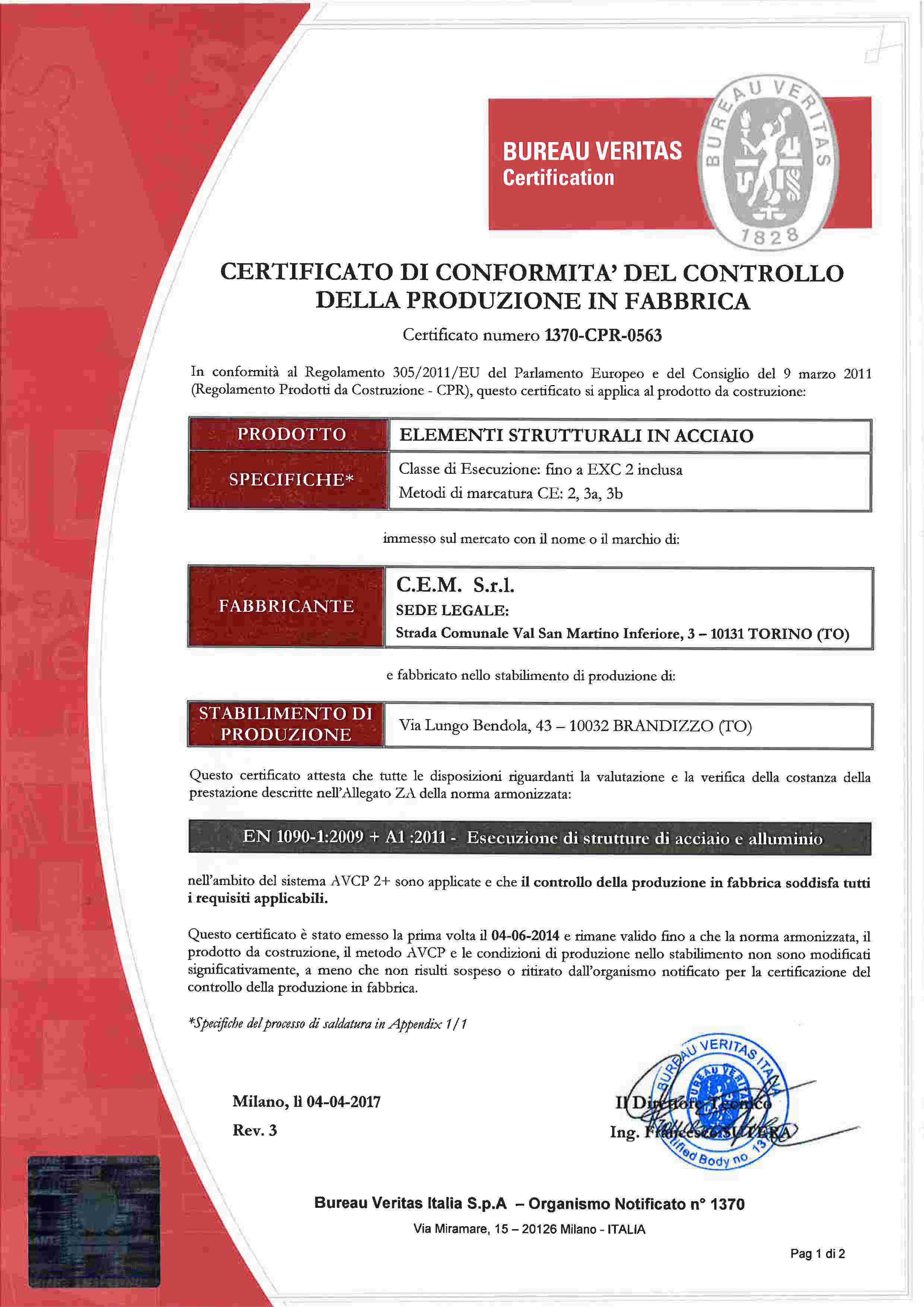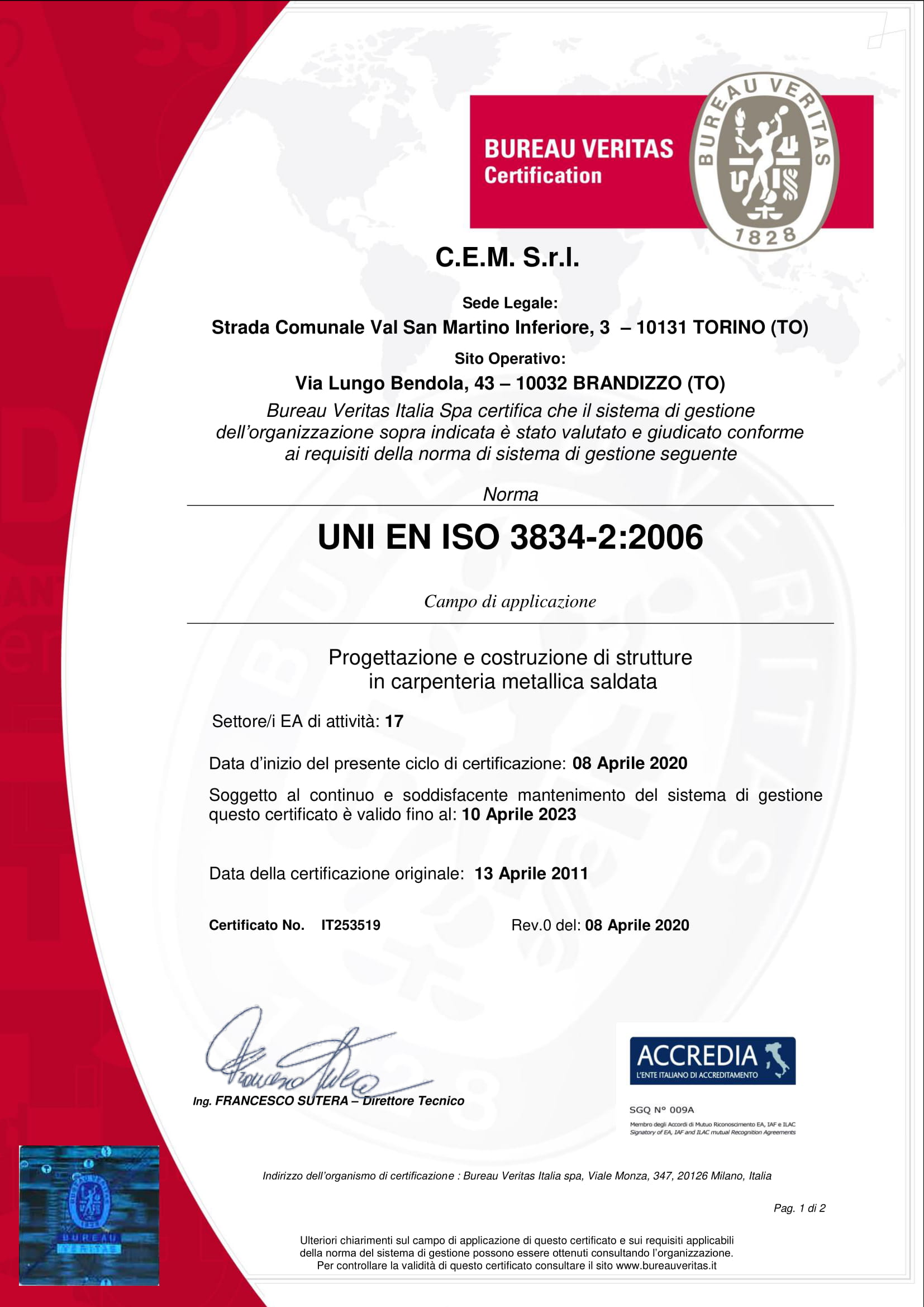 Proprio per la specificità delle attività della CEM, in questi anni sono state investite risorse significative nello sviluppo della conformità aziendale alle norme tecniche di riferimento, ottenendo la certificazione secondo la norma UNI EN ISO 3834 oltre che tutte le qualifiche tecniche dei saldatori secondo le norme tecniche di riferimento, e infine la certificazione secondo la norma UNI EN 1090 per la marcatura CE delle opere strutturali, in modo da essere all’altezza delle richieste del mercato.